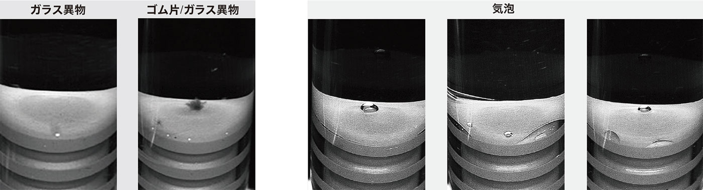 AIM 5022S AI+の最大の特長は、注射容器(シリンジ)のゴム栓上に生じた「気泡」を「混入異物」と識別できるAI機能を標準搭載したことです。注射剤内の気泡は品質には問題がないものの、通常の画像処理技術では異物と判別が難しく、気泡の入った良品が不良品として誤検知されてしまうことが課題となっています。そのため、気泡と異物の識別には、複数の検査ステーションで多角的に撮像し画像分析することで、検査精度を確保する必要がありました。